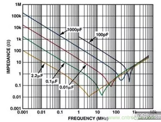 并联不同电容值的电容器有助于确保电源引脚在很宽的频带上出现很低的交流(AC)阻抗。这对于在运算放大器电源抑制比(PSR)衰减频率处尤其重要。该电容器有助于补偿放大器降低的PSR。在许多十倍频程范围内保持低阻抗的接地通路将有助于确保有害的杂讯不能进入运算放大器。(图一)显示採用多个并联电容器的优点。在低频段,大的电容器提供低阻抗的接地通路。但是一旦频率达到了它们自身的谐振频率,电容器的相容性就会减弱,并且逐渐呈现出电感性。这就是为什么採用多个电容器是很重要的原因:当一个电容器的频率回应开始下降时,另一个电容器的频率回应开始其作用,所以能在许多十倍频程范围内保持很低的AC阻抗。