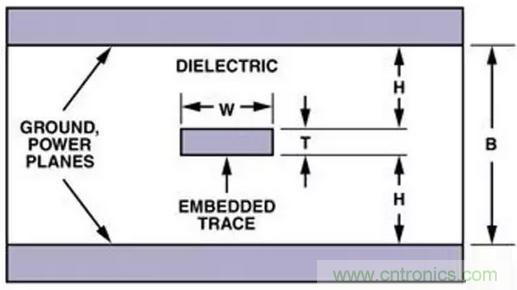 带状控制阻抗印制线(图十四)採用了两层接地平面,信号印制线夹在其中。这种方法使用了较多的印制线,需要的PCB层数更多,对电介质厚度变化敏感,而且成本更高,所以通常只用于要求严格的应用中。