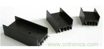 在实际使用过程中,用户常常在稳压源上附加散热片,以避免稳压源长时间工作在大负载下,散热条件不足,从而造成过高的温升而损坏元器件和电路板,图F1-17所示为常用的散热片。