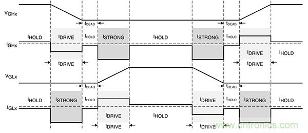 图6:用于三相BLDC电机的一个MOSFET桥中的高侧(VGHx)和低侧晶体管(VGLx)的电压和电流输入。 IDRIVE和tDRIVE对于正确的电机运行和效率非常重要; IHOLD用于将栅极维持在所需状态,ISTRONG防止低端晶体管的栅极 - 源极电容引起导通。 (图片:德州仪器)