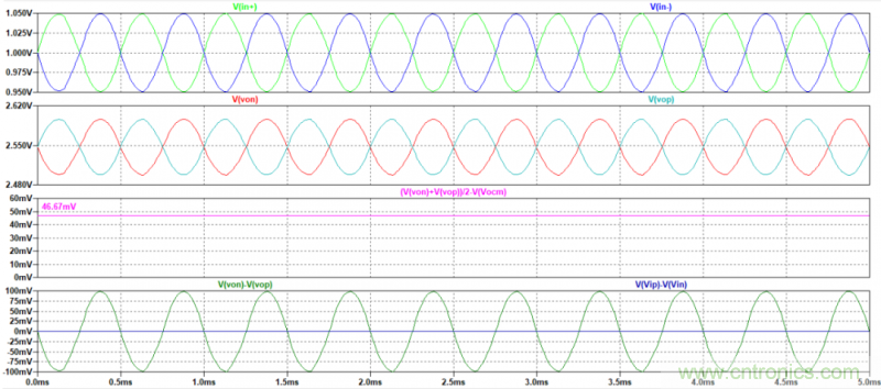 (4)全差分放大器两个输出端(Vout+,Vout-)的交流信号频率相同,幅值相等,相位相差180°,所以输出信号的偶次谐波可以抵消,降低输出信号失真。