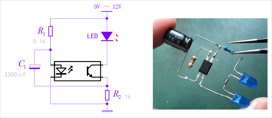 今天在西瓜视频中看到一个一分钟的短视频:光耦可以这样用,你绝对想不到的小发明[1] 展示了一个有趣的LED闪烁电路。核心是围绕找一个光耦(型号不详),外部增加相应的阻容和LED与器件,构成一个闪烁电路。