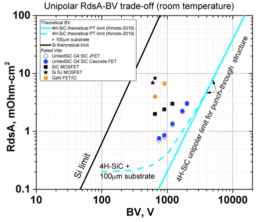 图1:比较多种半导体的具体导通电阻与电压