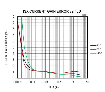 在负载电流为3A时,检测元件装置上VDD和LD之间的压降约为60mV(曲线图1),相当于仅有180mW的功耗,而在较低的电流值下,观察到的检测100μA范围的总误差在10%左右(曲线图2)。该方案在较高电流负载下功耗较小,在较低电流水平下仍能保持较好的误差预算,优于传统检测电路。因此,需要更大电流检测范围(最高可达3A)的应用可以从这个方案中受益。