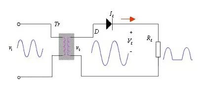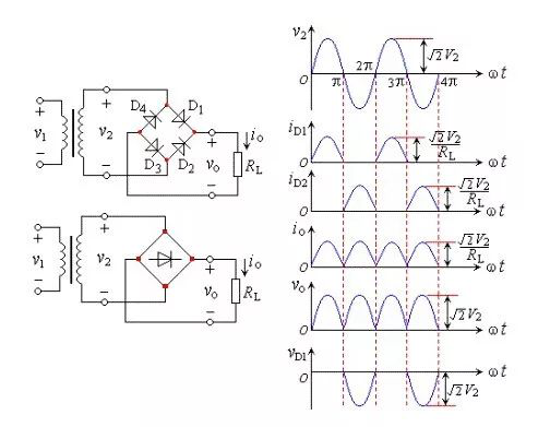 (1)半波整流电路:半波整流就是利用二极管的单向导电性能,使经变压器出来的电压Vo只有半个周期可以到达负载,如下: