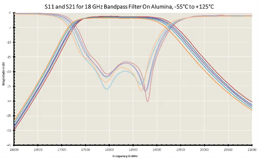此外,我们花费大量时间就基于各类基板的微带滤波器的温度稳定性进行了测试。图1和图2是两个18GHz带通滤波器设计的示例比较——其中一个批次是基于我们的CF基板,另一个则是在氧化铝板上完成的。我们测量了从-55℃到+125℃温度范围内的滤波器反应。