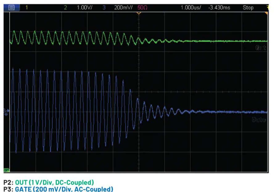 回到基本的NFET Colpitts振荡器,引入可切换栅极电阻后,可观察到 RGATE的阻尼效应(见图12)。当从0 Ω逐步增至10 Ω时,振荡会衰减,如图13所示。