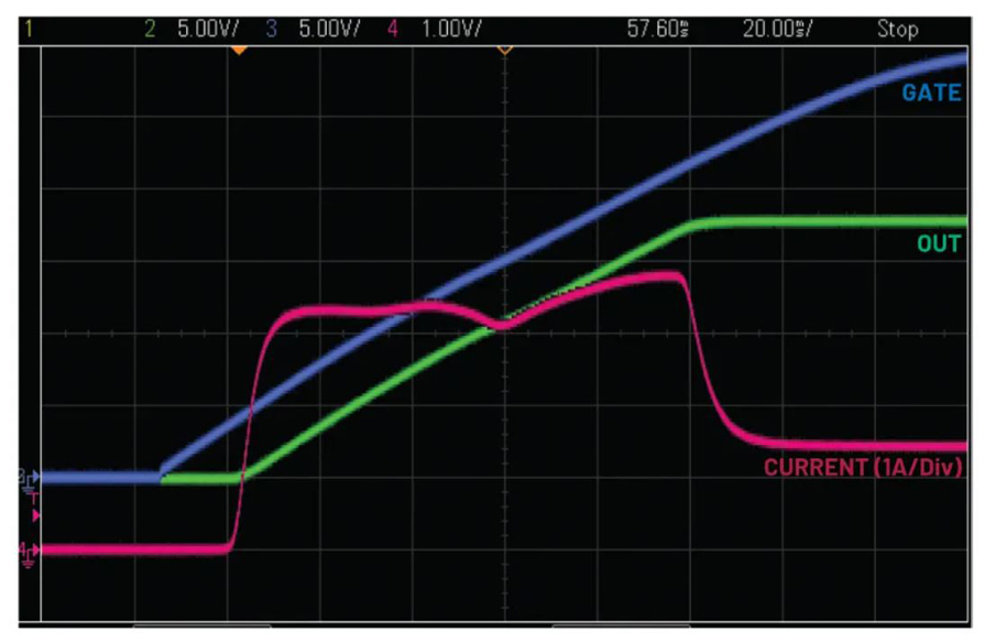 现在我们转到热插拔控制器,看看是否进行调整以引起振荡。演示板用于启动容性负载测试。在启动期间,栅极电压按照设定的dV/dt上升,输出也随之上升。根据公式 IINRUSH = CLOAD × dV/dt,进入输出电容的冲击电流由dV/dt控制。为了提高FET的跨导 (gm),冲击电流设置为相对较高的值3 A。