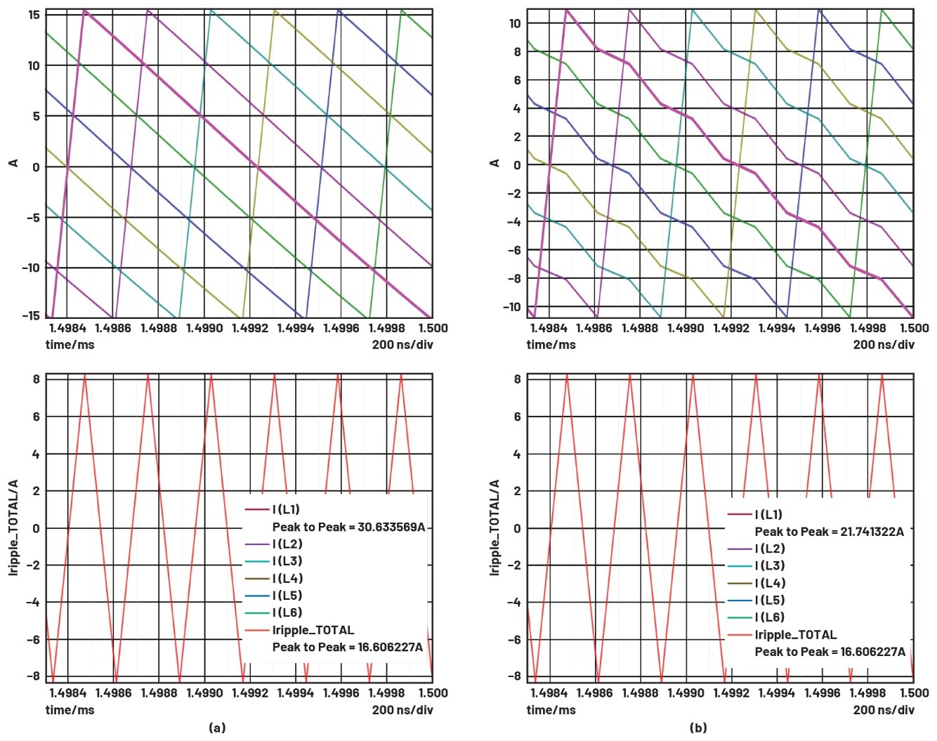 图4.6相12 V至1.0 V降压转换器的单个电感电流(顶部)和总输出电流(底部红色曲线),其中Fs = 600 kHz:(a) CL = 6× 50 nH,Lm = 50 nH,(b) CL = 6× 50 nH,且Lm = 200 nH。为了清楚起见,突出显示了第一个相位的电流I (L1)。对于任何Lm值,输出电流纹波均为相同的16.6 A。