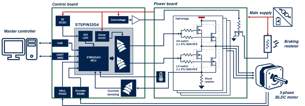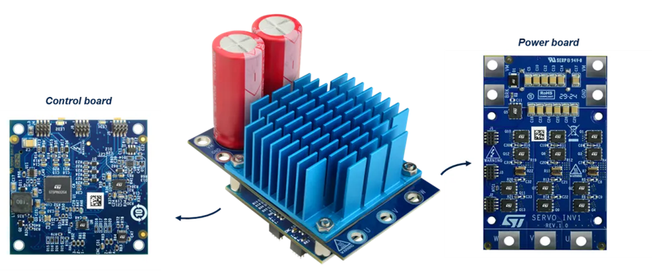 意法半导体 的 STSPIN32G4 将高性能STM32 microcontroller、三相半桥栅极驱动器和灵活电源管理电路集成于单芯片。微控制器负责高级电机控制算法,驱动器则全权控制功率级。新型 EVLSERVO1 参考设计(图1) 基于 STSPIN32G4,专为伺服驱动应用开发。