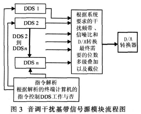 以0.02 MHz为步进产生梳状谱为例,根据系统选择的基带频谱的范围、信噪比依次产生450个以上的DDS,该DDS的时钟频率大于等于500 MHz,且受指令控制。当FPGA根据终端计算机发送的指令解析为某段频率为本方通信频率时,关断该段频率对应的所有DDS。最后FPGA将所有DDS产生的频点叠加输出到D/A转换器,经过D/A转换器送入前端混频器。该方案的优点是:干扰各个通信频点,而不是整个频带,即使有较严重的交调,但是其在该干扰点上的输出功率较整频带干扰方式还是大得多,并且功放较为容易计算所需功率。这种方式在终端计算机中需根据指令实时运算相应干扰参数,几乎可以选择任意可干扰和可开窗频段,且信噪比可达很高,不受控制激励模块硬件资源的限制嘲。图3为音调干扰基带信号源模块的流程图。
