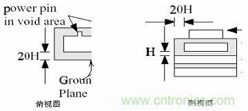 (由于RF电流在电源层和地层的边缘也容易发射电磁波,解决这个问题的最好方法就是采用20-H规则,即地平面的边缘比电源平面大20H(H是电源到地平面的距离)。若是设计中电源的管脚在PCB的边缘,则可以部分延展电源层以包住该管脚。)