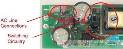 图1是这些非计划中电容的一个实例。图中的右侧是一个垂直安装的FET,所带的开关节点与钳位电路延伸至了图片的顶部。输入连接从左侧进入,到达距漏极连接1cm以内的位置。这就是故障点,在这里FET的开关电压波形可以绕过EMI滤波器耦合至输入。