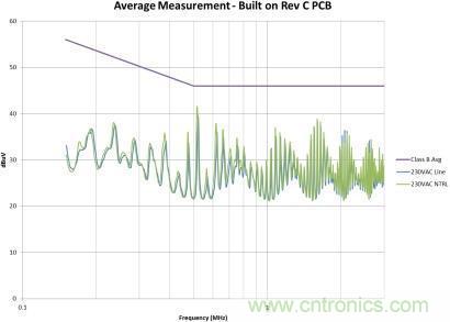 图4是修改后的效果图。我们在故障点位置为EMI规范获得了大约6dB的裕量。此外,我们还显著减少了总体EMI 签名。所有这些改善都仅仅是因为布局的调整,并未改变电路。如果您的电路具有高电压开关并使用了屏蔽距离,您需要非常小心地对其进行控制。