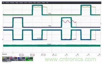 下图3显示的是关闭模板后示波器采集到的数据信号,每个信号的波形形状可以被清晰的显示和观察。示波器基于通道2的边沿触发,所有4个波形同时被捕获。