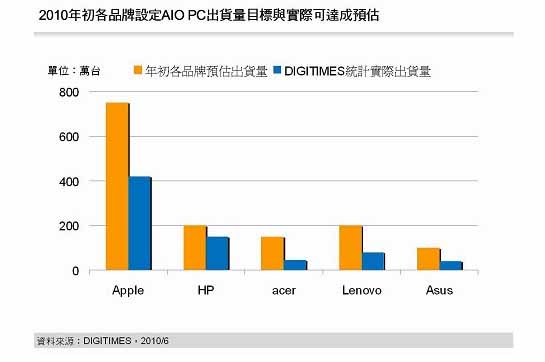 DIGITIMES Research预估2010年 AIO PC 市场将大幅成长,并进一步改写品牌市占率生态,2009年原领先的日系品牌明显下滑。苹果(Apple)虽仍将居第一大品牌地位,但市占率也可见大幅滑落,预估从2009年的50%降至2010年的38%。