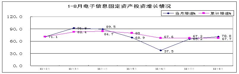 1-8月,电子信息产业500万元以上项目完成固定资产投资5602亿元,同比增长67.7%,高于工业投资41.1个百分点,增速是去年同期两倍多。分月来看,前8个月(除6月份稍有回落)月投资增速均60%以上,其中8月份完成投资795.5亿元,同比增长70.8%,增速比7月提高5.6个百分点。