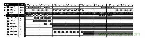 时序仿真可以采用两个可编程器件,一个用于数据发送及开关控制,另一个用于数据接收及功能判断。图8所示为数据发送FPGA 的仿真波形,S为FPGA输出开关控制信号;delay_sn,delay_clk,delay_clr三个信号为开关控制输入信号,实现将串行数据并行输出;P为FPGA输出给被测器件的信号,由dutin_r,dutin_s,dutin_clk,dutin_clr,IN 控制输入。可以看出,用FPGA产生时序是比较理想的选择。