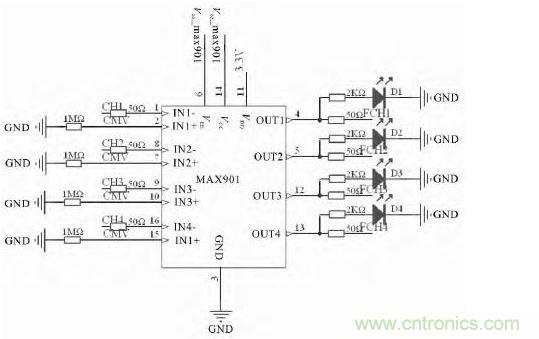 比较器选用Maxim公司推出的一款高速、低压差比较器MAX901,可以双电源供电,也可以单电源供电,输出电压可以根据用户要求进行设置。电路外围设计如图5所示。CHV 为比较电压设置,CH1~CH4为被测器件输出端口,FCH1~FCH4为FPGA 接收端口。通过设置MAX901比较电压,可以测试器件不同电压输出时的逻辑功能。D1~D4的作用是指示,方便调试。