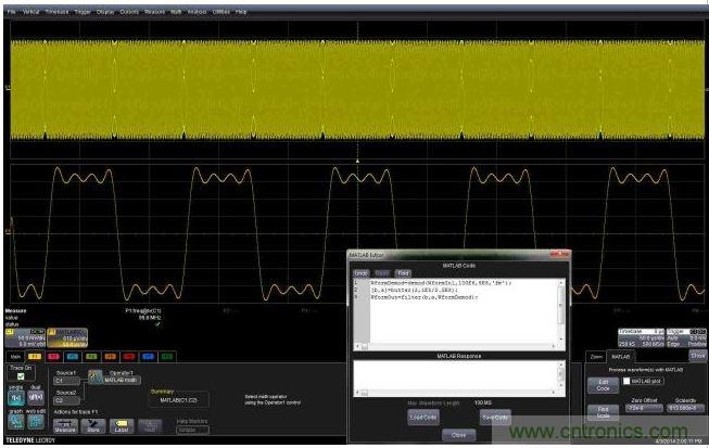 图5:这个嵌入式MATLAB脚本用于解调调频载波,并显示调制波形。编辑框允许用户不离开示波器环境就能完成脚本的创建或编辑。