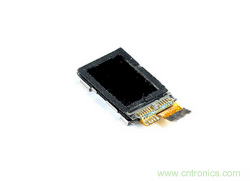 显示屏是固定在主板的屏蔽罩上,断开软板即可分离。采用了0.73英寸的PMOLED(被动驱动式OLED)屏幕,分辨率为128x88,210PPI的水准。被动驱动式OLED(PMOLED)是相对于主动驱动式OLED(AMOLED)而言的。优点是制作成本及技术门槛较低,结构简单,但受制于驱动方式,分辨率无法提高等,使得PMOLED屏幕不适合应用于大尺寸和高分辨率的面板上。