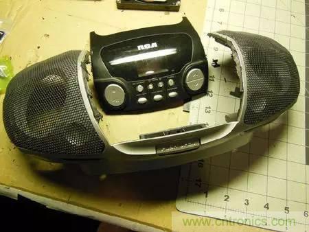 要想得到拼接机器人,你必须先将东西都拆开。你可以看到图中的受害者:一台美国无线电公司产的立体声音响。拆开后,我惊讶地发现里面非常空。我把这些东西拆开后,将它们都拼接到了一起,幸运的是这些东西都还能正常工作。这是一个看上去很好玩的立体声音响。当然,这些还不够,如果要做好机器人,我还需要找一些能当支架的废品。