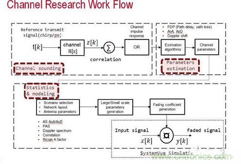 为了制订新的无线接口标准,研究人员必须能够评估RF通道的特性,才能了解RF讯号透过信道传递的方式。研究人员目前使用通道探测技术来收集「通道脉冲响应」(CIR)数据,以便利用信道参数估算算法撷取信道参数,接着再将撷取到的数据用于新信道模型的建构,如图1所示。