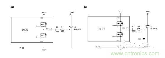 图3b给出了图3a示意图控制ACS器件(如本示例中的ACS108)特殊情况的变型。由于此类器件展示了COM和G端子之间的单独P-N节并能够阻止所有从G流向COM的电流,因此增加D1二极管,用于在微控制器I/O针脚处于高电平时对C1电容器充电。