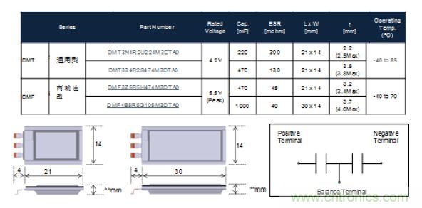 产品阵容如表1所示。DMT系列可在周围温度高达85℃环境下使用,是能够长期用于高温环境下的通用型产品。DMF系列ESR更低,更适合支持长时间大功率负载输出辅助。