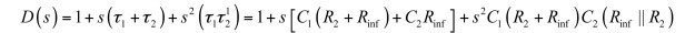 (14)?1和?2是所有储能元件(C和Ls )保持在直流状态(电容开路,电感短路)时获得的时间常数。 表示在时间常数1(上标数字)的元件处于高频状态(电容器短路,电感开路),同时确定在时间常数2的元件端的电阻。相反的, 表示在时间常数2(上标数字)的元件处于高频状态(电容器短路,电感开路),同时确定时间常数1的元件端电阻。然后将这些时间常数组合,成为如(14)的D(s)。