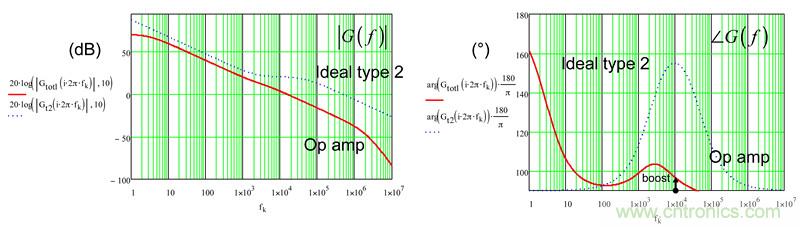 为确保运放内部不改变补偿器响应,通常的建议是在相同的图线上叠加理论型type 2幅值和运算放大器开环响应。在图11中,左图对应于我们第一次尝试建立的一个type 2补偿器,在10kHz处有65°相位增量和20dB增益。在该图中,运放幅值与type 2补偿器相交和相悖,导致我们想要的特征被破坏(最终的相位误差几乎有60°)。一看就很明显,这交叉表明,要么是选择的运放不适合,要么用type-2补偿器设置的目标过高。