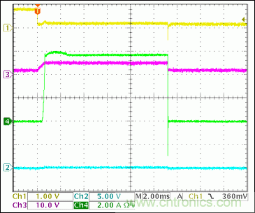 图7. -12V负载关断,150mA负载Ch1 = Q8BASE, Ch2 = -12VGATE, Ch3 = -12VOUT, Ch4 = IIN(-12V)
