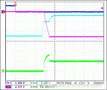 图12. +3.3V接通波形,没有负载Ch1 = Q8BASE, Ch2 = +3.3VGATE, Ch3 = +3.3VOUT, Ch4 = IIN(+3.3V)