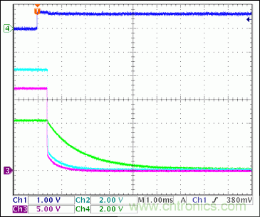 注释:虽然由于输出电容放电导致VOUT(-5V)没有达到0V,-5V在1ms内下降至零。