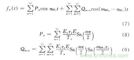 在式(6)中,第一项是基带的谐波信号,是由量化所产生的频谱成分,只有在基带滤波器内,谐波将成为寄生信号,所有nωi》ωs/2的项将被滤除(n取奇数);第二项则完全在滤波器外,不用考虑;第三项是交调信号,满足(mωs-nωi)《ωs/2的所有成分,将成为交调寄生信号,它们是信号谐波与时钟谐波的交叉调制引起的。若以D表示脉冲信号占空比,且忽略第二项,则式(6)变为: