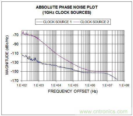 图 2. 两个不同时钟源的绝对相位噪声测量值。