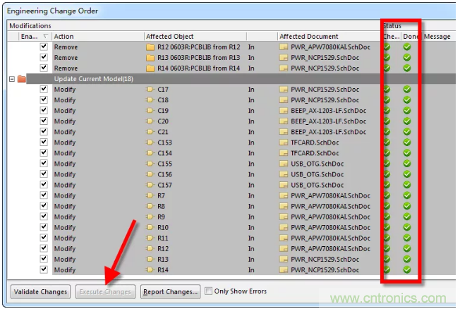 4、对封装进行完编辑或添加等操作之后,执行右下角的“Accept Changes(Create ECO)”命令,对更新内容点击“Execute Changes”更新到原理图当中,如图1-4。