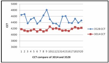 初始参数测试结果表明,在20mA电流驱动下,3014LED的光通量比3528高,且其CCT集中度比3528LED好。另3014一般在30mA电流下驱动使用,其光通量达到10~11Lm;如上节热模拟显示,3528LED散热效果远不如3014LED,故其在大电流驱动下,光通量必定会严重受到过高热量的影响。因此相比水平散热LED,垂直散热LED具有不可比拟的优势。