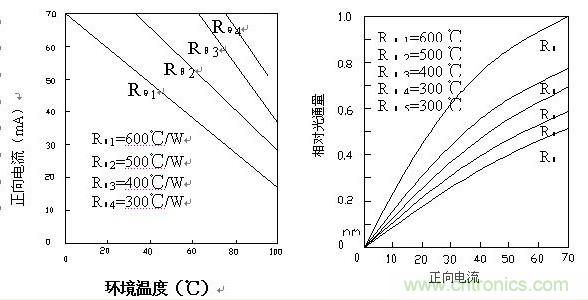 实践指出,LED的热阻将严重影响器件的使用条件与性能。下图指出了具有不同热阻值的LED,极大正向电流随环境温度的变化。由此可见,对于确定的环境温 度,热阻越小,所对应的极大正向电流就越大。这显然是由于,当热阻较小时,器件的散热能力较强,因此为达到器件的最大结温,器件工作在较大的正向电流。反 之,如器件的热阻较大,器件散热不易,故在较小的正向电流下,LED即可达到最大结温。