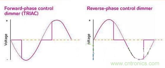 并不是所有相位控制器都从交流正弦波的同一方向切断。三端双向可控硅器件(TRIAC)用于白炽灯和卤素灯调光,它从正弦波的前相开始切断,在切断点位置,输入电压刚过零,输入电流刚反向。因此,它也被叫做前相控制调光器,前相控制调光器会在开始导通的时候产生电流尖峰,此尖峰电流会引起蜂鸣声和增加电子驱动器的压力。