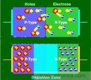 因此,电子空穴本身就显示出是从正电区域流向负电区域。二极管是由N型半导体物质与P型半导体物质结合,每端都带电子。这样排列使电流只能从一个方向流动。当没有电压通过二极管时,电子就沿着过渡层之间的汇合处从N型半导体流向P型半导体,从而形成一个损耗区。在损耗区中,半导体物质会回复到它原来的绝缘状态--所有的这些“电子空穴”都会被填满,所有就没有自由电子或电子真空区和电流不能流动。