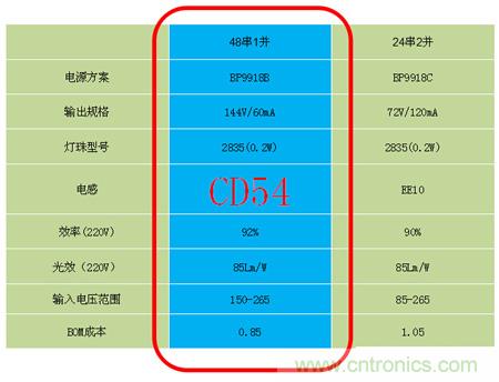 从上图各种参数对比我们可以看出,单从成本来看,一定是线性方案最低,但同时会存在一些问题,比如光效,效率并不是很理想,最关键的一点,线性方案温度较高,因为铝基板温度高而造成的硫化而存在一定的风险。所以,从整体参数对比来看,66串1并的方案是性价比最高的。同理,8W T管方案推荐的是单串1并BP9918B的方案,单片集成工艺,集成启动电阻,极简的外围电路,系统成本极具竞争力,其中值的一提的是该方案采用了CD54电感,可将BOM成本可以做到大概在0.85左右,且可以实现全贴片的方案,从而帮助客户降低人工成本。