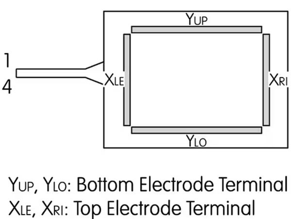 四线触摸屏在底板和顶板上各装有两个电极。底板上的电极沿 Y 轴延伸,使其能够测量沿 X 轴的电阻。同样,顶板上的边缘电极沿 X 轴延伸,使其能够测量沿 Y 轴的电阻(图 2)。