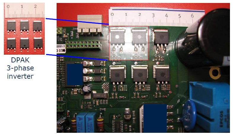这是一个实际的PCP板上的IGBT的图,我们看到如果用D2PARK的话,它两颗的面积大概在2.5厘米,而如果使用DPARK封装的话可以减少到1.5厘米左右,同时它跟IGBT模块来相比的话可以节省0.5个美金的成本,所以对于一些消费类市场低成本的产品这个相当重要的。