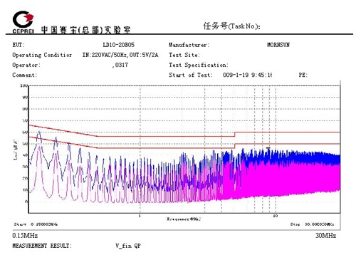 5. 具有较低的EMI性能。EN55011有level B,level A两个等级,level B比level A严苛得多。图2、图3是LD10产品的EMI测试数据,该数据由国家电子五所专业测试。测试结果可以看出,该系列电源具有较低的电磁辐射性能,达到EN55011,level B的要求。