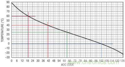 图 3:7 位热敏电阻器 ADC 显示 LTC4155 的预置温度跳变点