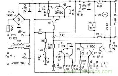 当超载时电阻R8上的压降增大,该压降达到0.6V时可控硅SCR导通,使Q1基极电位下降到1V左右,于是管Q1和调整管Q2、Q3均截止,保护调整管免遭烧坏。Q2、Q3截止后输出电压为零,电子开关Q4截止,Q5导通,使Q6、Q7组成的多谐振荡器起振(几十赫芝),发光管LED2闪亮,以示告警。当输出端短路时(最大超载),R8上压降远大于0.6V,可控硅立即导通,同样切断稳压输出。当短路故障排除后,只要按一下复位按钮AN,使可控硅“复位”,稳压电源立即照常工作。这时Q4正常导通,Q5截止,Q6、Q7停振熄灭。该电源容易制作,Q2、Q3的放大倍数应接近一致。电阻R2、R4、R5、R6,R17选用l/2W,其余均为1/4W,电阻R8用直径0.25mm、长18Cm的康铜丝6根并联而成。若无康铜丝也可用8只1/4W2.2O欧色环电阻并联而成。该电阻只对保护电流设定值有影响而与稳压精度无关。调整管散热器采用市售铝合金专用散热器,装在铁壳外。