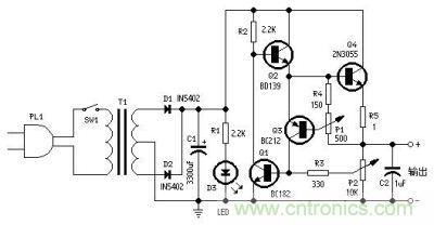 电容C1可以从2200-6800uF/35-50V之间选择。BC182 为50V/100mA/NPN三极管;BD139为80V/1.5A/NPN三极管;BC212为50V/100mA/PNP三极管;2N3055为60V/15A/NPN三极管。