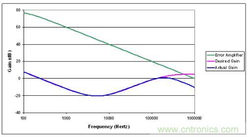 第二种常见错误是让放大器提供超出其能力范围的增益,图2描述了这种错误。它显示了理想的误差放大器频率响应、放大器的增益以及给定误差放大器限制的预计性能。由于其带宽限制的存在,放大器无法给出理想的高频增益。尽管图中未能显示,但相位也受到严重的影响。电压模式转换器(如图1所示)中需要高频大增益,这时问题会更加突出。设计误差放大器补偿时,请特别注意其带宽限制,否则您最终需要使用一个震荡电源。