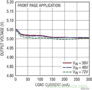 以边界模式工作时,负载调节非常好,因为反射的输出电压始终在二极管电流过零时采样。LT8300 一般提供好于 ±2% 的负载调节,如图 4 所示。